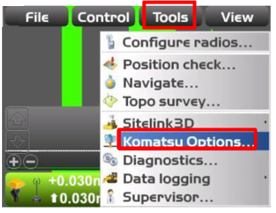 1') Click the "Tools" button on the display and select "Komatsu Options."