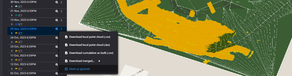 ・Construction history data acquired from Komatsu ICT construction equipment is displayed in yellow.