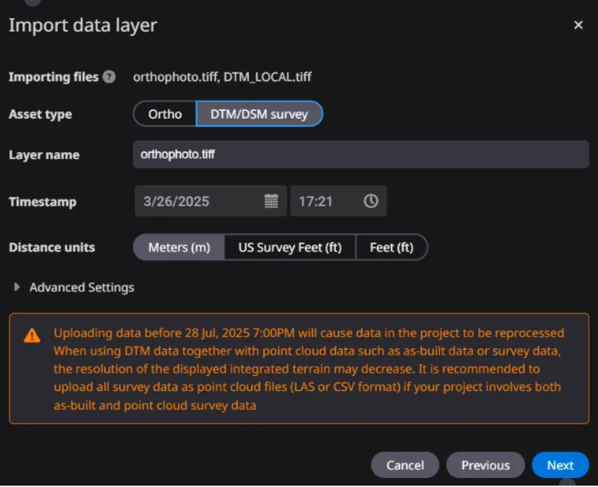 | 1 | Other | Data layer | When integrating DTM survey with normal point cloud survey, some terrain may not be displayed at DTM quality. Therefore, when uploading a DTM, the following warning message will now be displayed. When using DTM data together with point cloud data such as as-built data or survey data, the resolution of the displayed integrated terrain may decrease. It is recommended to upload all survey data as point cloud files (LAS or CSV format) if your project involves both as-built and point cloud survey data. |