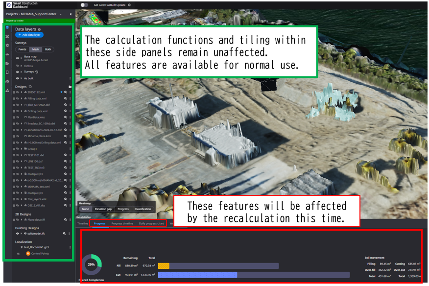 | 3 | Bugfix | Progress | The calculation results displayed in the “Progress” tab at the bottom of the screen sometimes showed different values from the Measurement feature. We have fixed this issue so that the same values are now displayed. [Note] After release, Progress will be recalculated the first time user opens the Dashboard. The progress heatmap will not be displayed until recalculation is complete. During recalculation, all other functions will remain available as usual. Additional Information The scope of the recalculation affects only certain features. |