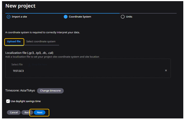 ・Click 【Select coordinate system】 and locate your site on the map and install the parameter file.