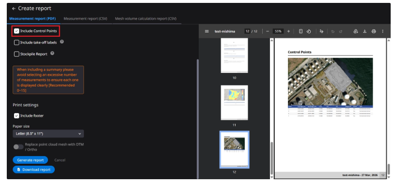 | 1 | New | PDF report | Added a feature to include a list of control points in PDF reports. When the "Include Control Points" checkbox is enabled, a control point list page will be added to the PDF report. |