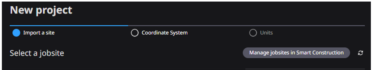 5. Now that your site is created in SC Portal, go back to the tab where Dashboard is open and click the refresh symbol to the right of "Manage jobsites in Smart Construction". The site you just created in SC Portal will show. Click the name of your site and proceed to the next step.