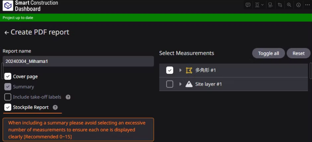 Stockpile for “Smart volume” measurement can now be output in PDF reports. Users can easily review the stockpile for each “Smart volume”.