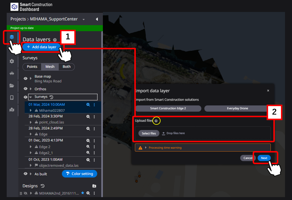 2. 【«2»Arrastre y suelte el archivo con los datos del historial de construcción (datos tal y como se construyó) o cárguelo desde una carpeta local】 y haga clic en 【Siguiente.】