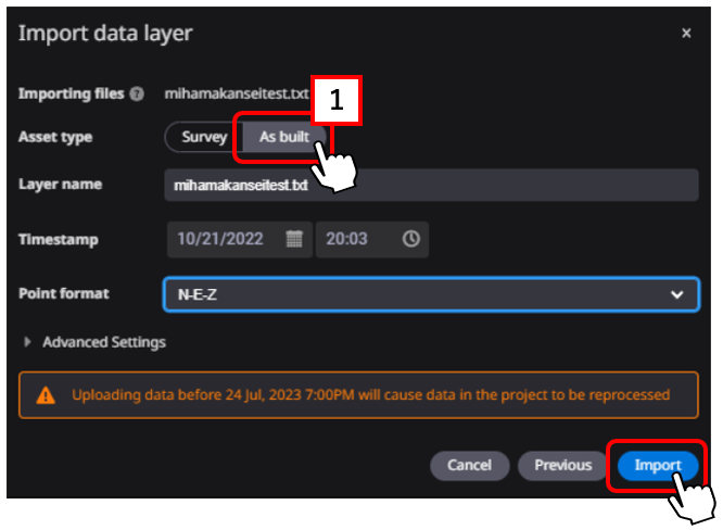 Establezca la marca de tiempo (fecha y hora de finalización de la construcción) como la hora registrada y haga clic en 【Importar】.