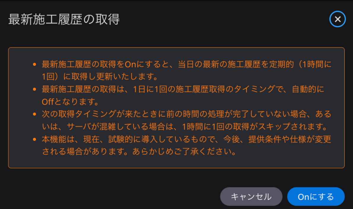 ・取得時間は1時間に1回となっており、1日の施工履歴取得のタイミングでボタンは自動的にOFFになります。